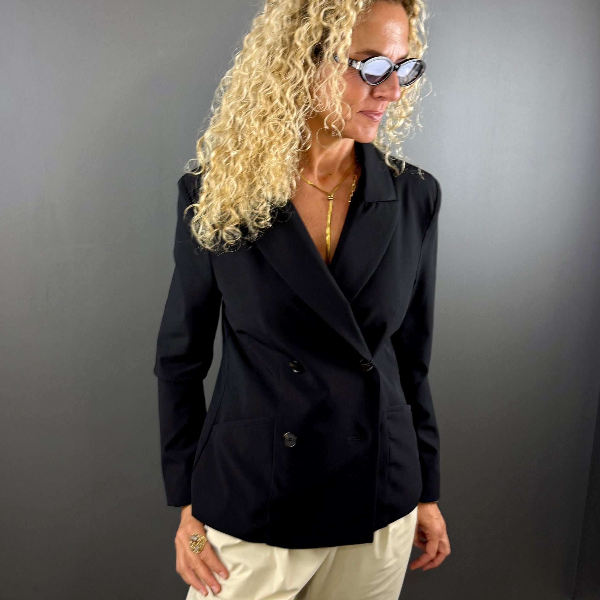 Blazer negro cruzado MONACO. Extremadamente cómodo y ultraelástico, nuestro tejido de doble elasticidad permite una gran libertad de movimiento, proporcionando una maravillosa sensación de confort.